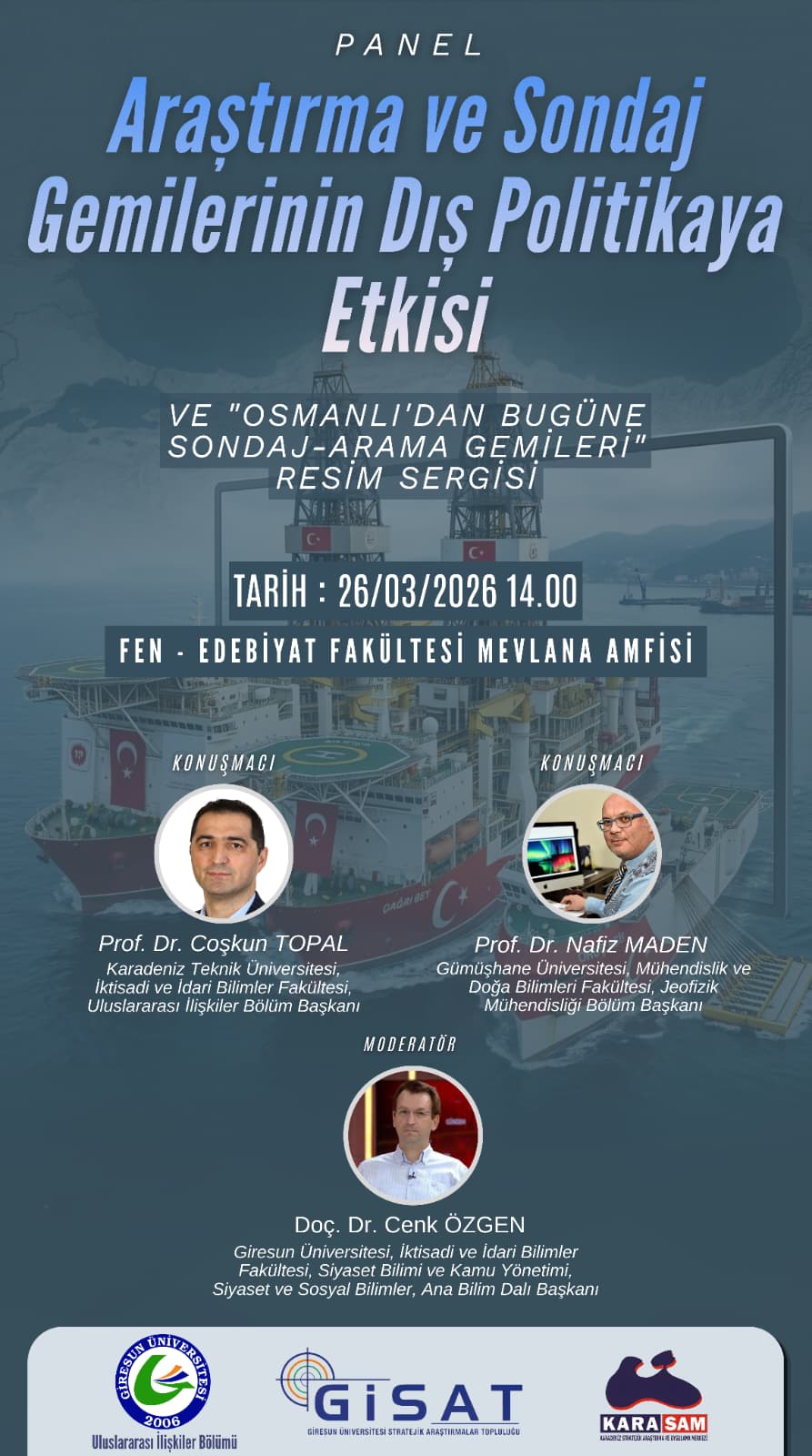 The Department of International Relations cordially invites all students and interested participants to a panel and exhibition organized in collaboration with the Giresun University Strategic Research Society and the Black Sea Strategic Research and Application Center. The event will also feature an exhibition titled “Drilling and Exploration Vessels from the Ottoman Period to the Present,” which will be open to visitors.